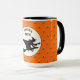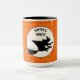 Funny Halloween mug featuring flying witch on orange polka dot background.