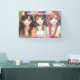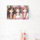 Personalised happy birthday banner. Three cute anime girl about pre-teen or teenage age, with pink and yellow flowers around them.