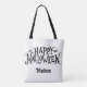 Transform your Halloween trick or treating into a stylish night out with this custom Happy Halloween tote bag that can personalised with a name. With its spooky yet whimsical charm, this tote bag is sure to send shivers down spines and excitement through your veins! Easily edit the name and add to your cart!