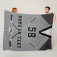 Personalised Hockey Blankets in Any Colours and 3 Sizes. Shown in Large Grey and Black Hockey Fleece Blanket. CALL Designer Linda: 239-949-9090 to CHANGE the COLORS to Your Hockey Team Colours or Your Hockey Room Decor for boys and girls. Available in Large, Medium and Small Personalised Hockey Blankets. Unique original design. Shoulder are Hockey Pucks with Crossed Hockey Sticks and Player's Name and Jersey Number. Jersey Hockey Bedding Accents.