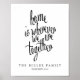 A wonderful piece of modern wall decor that reads, "home is wherever we are together". Perfect for families, as housewarming present or gift for the newly married couple. Contemporary text boldly printed in black text with whimsical typography and personalised with family and established date, but can be customised to any two lines of text. Shown on a crisp white background for simple and classic style.