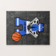 Fun Basketball design for the young ice basketball player or basketball fan. Feature the letter A in blue and white team colours with Basketball high tops and basketball. Background features chalkboard design basketball terms and images