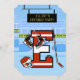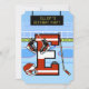 Fun hockey design for the young ice hockey player or hockey fan. Feature the letter E in red and white team colours with co-ordinating hockey stick, helmet , skates and puck. Background features ice hockey rink with customisable scoreboard for your personalised message