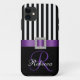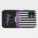 This monogrammed black and white stripes iPhone 5 Case-Mate Case has a photo of this design embedded into the hard plastic cover. The design is made up of a black and white striped pattern, a printed purple ribbon, diamond brooch and a black bottom portion where you can add your name and monogram initial in gorgeous script fonts. This iPhone 5 case cover is the perfect way to accessorise your iPhone 5. Be stylish and girly all at the same time. Design by Elke Clarke©2012. Graphics licensed for use.