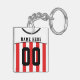 Easy to edit soccer / football / sports jersey keychain, just use the boxes to the right of the image to insert your own choice of name and number on the back. The design of this jersey has red stripes, with black v-neck trim. The background colour can be edited, just click on CUSTOMIZE.