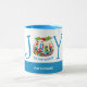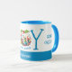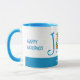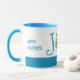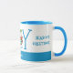Fun, festive JOY TO THE WORLD Christmas Holiday Mug. The text says JOY TO THE WORLD in cyan blue typography. The O in JOY is represented by a festive Christmas pudding, incorporating a selection of FLAGS OF THE WORLD. On the left, the text says HAPPY HOLIDAYS and on the right, it says SEASON'S GREETINGS - both of these are CUSTOMIZABLE. Underneath there is a placeholder name inside a cyan blue stripe, which you can also replace with your name or text, which wraps around the width of the mug. Christian Scripture version also available.