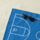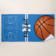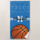 Personalised kids beach towel featuring a blue background that can be changed to any colour, a basketball court, your initials, name and and a basketball.