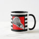 Unique lacrosse mug featuring lax stick art on red background with black and white stripes. Edit text to add name of your favourite lacrosse player, coach or team sports fan.
