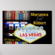 A distinctive Las Vegas wedding poster for your special event in Las Vegas, Nevada. Personalizedcasino slot machine and famous welcome sign from Las Vegas Boulevard. For weddings or receptions in hotel ballroom areas, brides and grooms often set posters such as this on tripod easels outside their location to help invited guests know that they've found the right place. Personalise with the names of the couple and date.