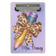 Stay organised in style with this personalised clipboard, featuring a trendy pencil design adorned with a chic leopard print coquette bow on a purplish pink background. Perfect for teachers, students, or anyone who loves stylish stationery, this custom clipboard adds a touch of personality to your classroom or office. The sturdy construction and smooth writing surface make it practical for everyday use, whether you're grading papers, taking notes, or managing tasks. Personalise it with your name or a special message to create a unique and functional accessory. Ideal as a back-to-school gift or a thoughtful present for any educator, this clipboard is both fashionable and functional, making it a must-have for any workspace.