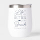 Celebrate life at your seaside abode with this cute personalised wine tumbler featuring the phrase "life is better at the beach" in navy blue lettering accented with nautical flair. Customise with your family name and/or year established beneath.