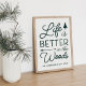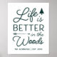 Decorate your woodsy abode or cabin with this frameable print featuring the phrase "life is better in the woods" in deep hunter green lettering accented with a pine tree and an arrow. Personalise with your family name and/or year established beneath.