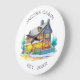 Pretty Christmas clock with a pretty watercolor log cabin and pine trees.