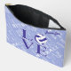 Cute personalised love netball design, with painted letters and netball for the O, background is powder blue with various netball positions, terms and netball related themes in the background in white.