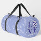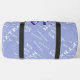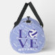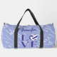 Cute personalised love netball design, with painted letters and netball for the O, background is powder blue with various netball positions, terms and netball related themes in the background in white.