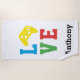 Love video games. Make a splash this summer with this personalised beach towel. It has LOVE and O is a video game controller Personalise with a name. Great for a birthday gift for that gamer. Customise the background colour to anything you prefer, just hit customise button.