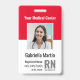 Personalise these vertical medical personnel badges with an employee photo and name, along with multiple custom text fields for title or role, unit or floor, title abbreviation, employee ID number, and valid through date. The healthcare facility or hospital name appears at the top in bold white lettering. Customise with a barcode on the back if needed, along with return information or other details.