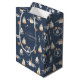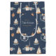 Celebrate the season in style with this elegant personalised Christmas gift bag. Featuring a festive watercolor pattern of candles, ornaments, wreaths, and gifts on a navy blue background. Perfect for wrapping presents, party favours, or corporate gifting.