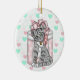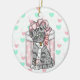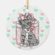 Adorable hand drawn grey kitty cat with a pink bow on with mint green and pink heart background. Personalise this ornament on the back.