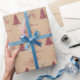 This rustic country Christmas wrapping paper has two Christmas trees in plaid and polka dots patterns in muted shades of burgundy, tan, and green with stars on top of the trees. There are also two plaid standing deer in a matching colour scheme. The buck has dusty blue-grey antlers. There is fancy burgundy lettering that says "Merry Christmas" beside the trees. It is also personalised with your family name or other text in burgundy lettering or you can delete it if you don't want to personalise it.