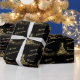 This festive personalised black and gold Merry Christmas wrapping paper has a gold tone Christmas or Holiday tree with ribbons and stardust on it. If you need any matching items, or if you need assistance or changes, please email niteowlstudio@gmail.com.