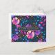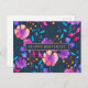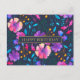 Colourful vibrant watercolour flowers and sprigs reworked into a repeating pattern. A rainbow of fluro colours stand out against the dark navy blue background. Add your personal message to the front - Happy Birthday,Happy Anniversary , Thank You or whatever sentiments you would like to send.