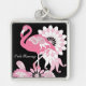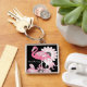 The product design features a flamingo with kaleidoscopic paisley patterns in shades of pink. This tropical bird illustration with personalised text makes a modern and unique keychain.