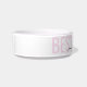 Bubblegum pink cat bowl with "BEST CAT EVER" and your cat's name customised in a chic and elegant calligraphy script font text overlay. Enter any personalised text you like for the background and top layer of text to create your own personalised pink ceramic pet food or water bowl. See our collection of coordinating bowls and get a set!