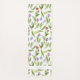 The product design features a pattern of colourful tulip flowers in purple, red, pink, blue, and yellow. This botanical illustration with personalised text and back colour makes a modern and unique yoga mat.