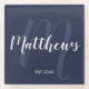 featuring family name in white modern script font style and monogram in light navy blue modern script font style as background