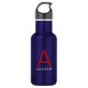 Red, White, and Blue Personalised Name and Initial Letter Stainless Steel Water Bottle with a Custom Monogram in a trendy modern and minimal classic sans serif font for a simple but sophisticated and masculine look. Shown in red and white on a blue metallic water bottle, the text colours and fonts can be changed, and several bottle colours are available in small and large sizes.
