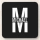 featuring personalised monogram in white bold modern sans serif font style with box of name in the middle of monogram on black background.