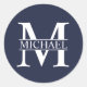 featuring personalised white monogram in classic serif font style with box of name in the middle of monogram on navy blue background.