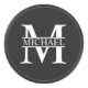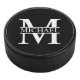 featuring personalised white monogram in classic serif font style with box of name in the middle of monogram on black background.