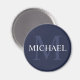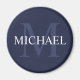 features personalised name in white and monogram in light navy blue as background, in classic serif font style,