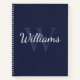 features personalised name in white script font style and monogram in light navy blue serif font style as background, on navy blue background.