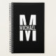 featuring personalised monogram in white bold modern sans serif font style with box of name in the middle of monogram on black background.