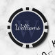 features personalised name in white script font style and monogram in light navy blue serif font style as background, on navy blue background.