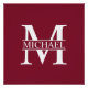 featuring personalised white monogram in classic serif font style with box of name in the middle of monogram on burgundy red background.