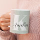 Personalised sage green mug featuring your monogram initial in modern large white typography and your name in a stylish calligraphy signature script.