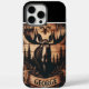A wooden sign featuring a moose head with large antlers, set against a background of trees. A banner below reads GEORGE.