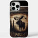 A custom wooden sign features a silhouette of a moose standing in a forest, with the name Paul carved beneath. The background is a rustic woodgrain with a burnt effect, adding to the rustic charm.