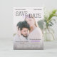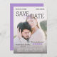Unique save the date card inspired by a typical movie poster design with title, your names, quotes from critics, your custom photo, and more with a purple accent colour.