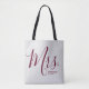 Whether a new bride or veteran wife, she will love this tote. Burgundy text is designed over a silver background. This design includes her married title of "Mrs.", her name and established year...personalised in decorative burgundy typography. She will love showing this off!