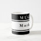 Change name on mug under the "Personalise it" tab. colour of background stripes can be changed by clicking the "customise" button below mug, then click "Edit">>"Background" and select a colour.