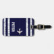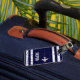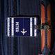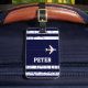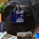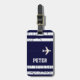 Travel related item . A blue design with the image of a plane, stripes and your name