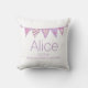 Pretty bunting flag drawing doodle art personalised pillow. Simple flag design on a white background or you can customise the background to the colour of your choice if required. Personalise with your own name, initial on the centre flag, and your name meaning currently reads Alice Noble, strong yet tender & very sweet. © Original drawing and graphic design and words by Sarah Trett for www.mylittleeden.com and namesense