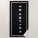 An elegant personalised name black and white beach towel. Customise the elegant script typography with your text. Ideal gift for an anniversary, wedding gift, bridal shower or honeymoon gift.