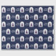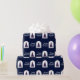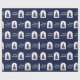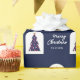 Personalised Name Blue Chequered Christmas Tree Pattern Wrapping Paper. Shown on a dark blue background with white text. The Christmas tree is in a fun retro chequerboard pattern in blue, pinks, purple, and teal on a white arch. Personalise with a name. © Kimbellished, LLC
