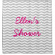 Personalised name chevron pattern shower curtains. Elegant grey chevron zigzag pattern shower curtain with neon pink text template. Stylish script typography. Zig zag stripe bathroom accessories for men and women. Cute print design. Custom size and colour. Trendy home decor.